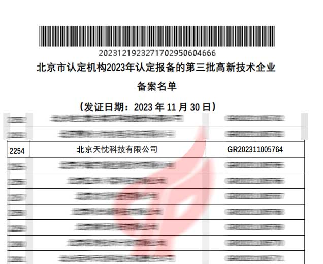经过北京市认定机构 2023 年审核公布,北京天忧科技有限公司荣获“2023 年第三批高新技术企业”认定,这是北京天忧科技有限公司取得的又一项成果!